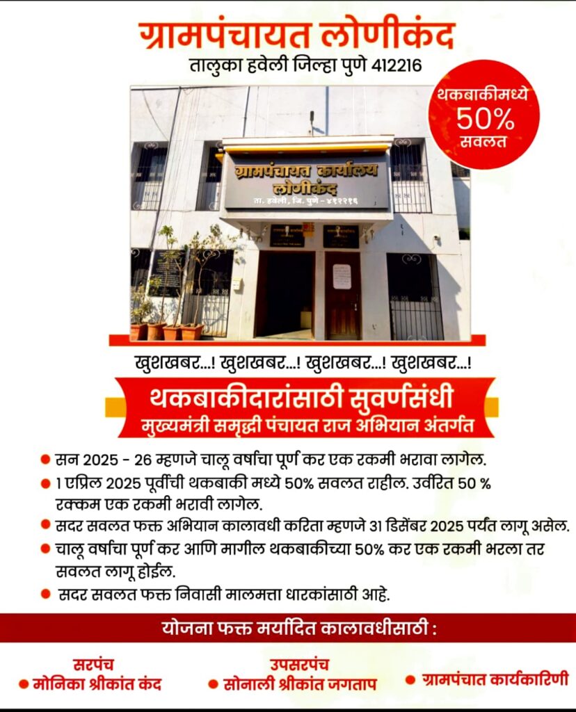 पुणे जिल्ह्यातील हवेली येथील लोणीकंद ग्रामपंचायत स्वच्छ, शिक्षित आणि डिजिटलदृष्ट्या सक्षम गाव निर्माण करण्यासाठी वचनबद्ध आहे. आम्ही स्वच्छता, पाणीपुरवठा, ग्रामीण रस्ते सुधारण्यावर आणि सक्रिय नागरिकांच्या सहभागाद्वारे शाश्वत विकासाला चालना देण्यावर लक्ष केंद्रित करतो.